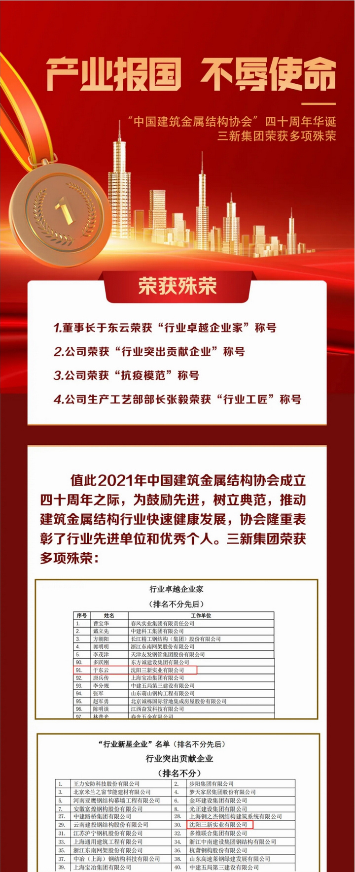 產業報國 不辱使命——“中國建筑金屬結構協會”四十周年華誕,三新集團榮獲多項殊榮