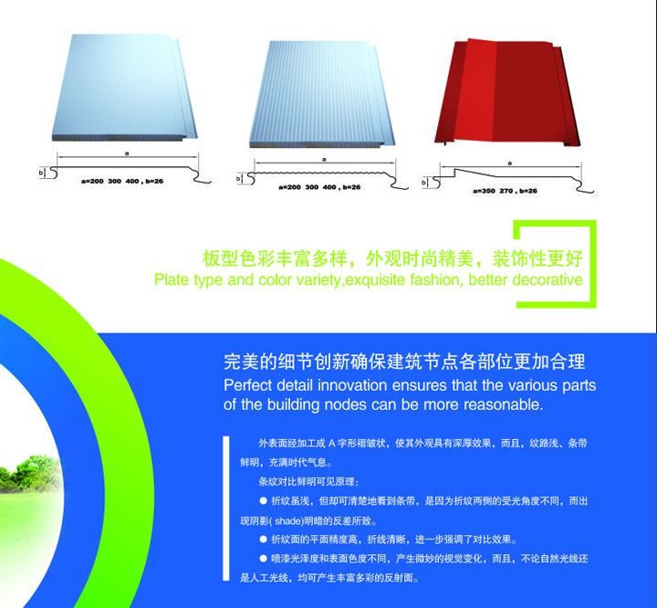 SX-400幕墻板創新的節點結構,獨特的安裝方式,確保外墻的墻面、墻角全無釘。使用三新工業金屬幕墻板建筑外墻,整潔、美觀,可以達到理想的建筑表面裝飾效果??茖W嚴謹的項目管理工作是確保工程安裝能真實地符合三新集團金屬建筑系統技術體系要求的根本保障。